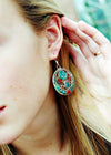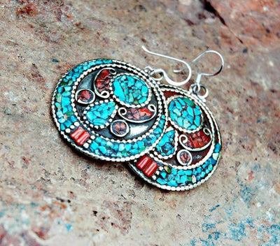 A marvelous pair of traditional Tibetan earrings with turquoise and coral inlaid into delicately handcrafted metal work. Handmade in Kathmandu, Nepal.