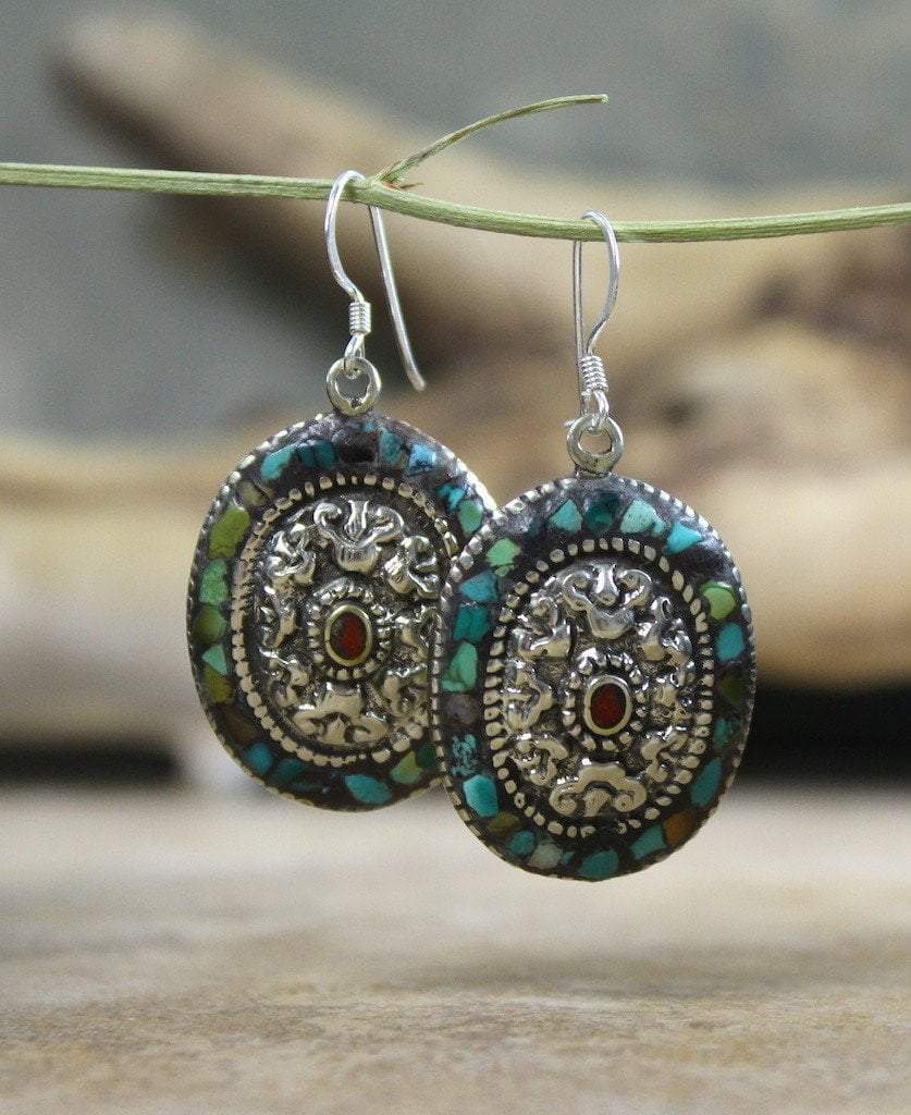 Handmade in Kathmandu with turquoise and coral inlay, sterling silver french hooks