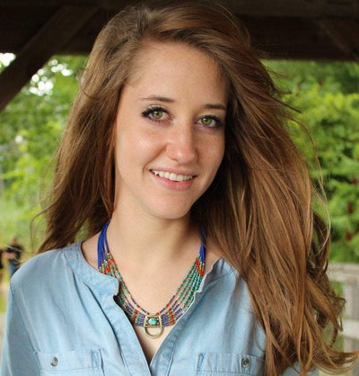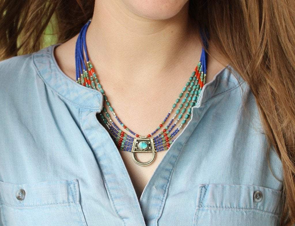 A stunning Tibetan necklace handmade by Karma Dolma in Kathmandu. 7 strands of turquoise, lapis and coral connect the focal Tibetan silver setting.