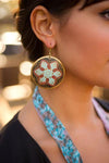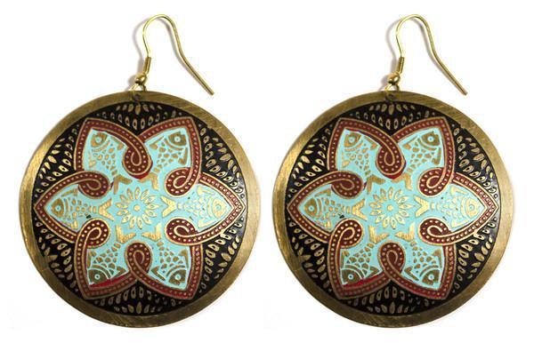 Hand painted and etched patterns on golden metal base. Repetitive pattern in soft cool tones emerge from center of earring.