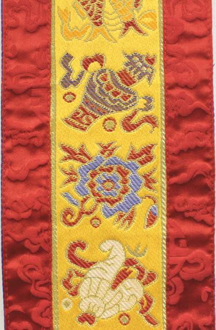This vertical red and gold banner is a great addition to any shrine room. This silk banner is hand embroidered with the 8 Auspicious symbols and backed with cotton and polyester for long life. Multicolored fringe hangs from the bottom.