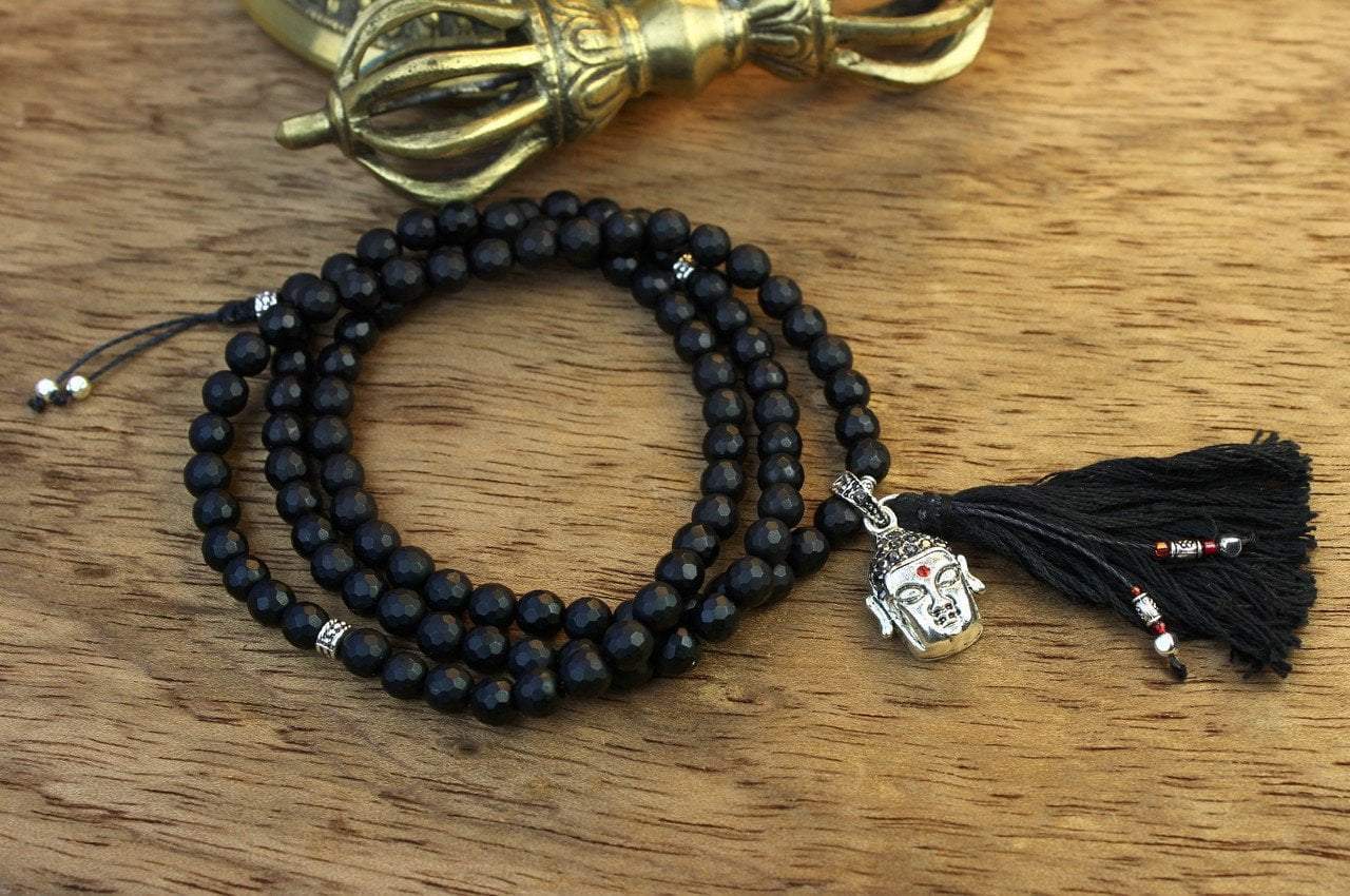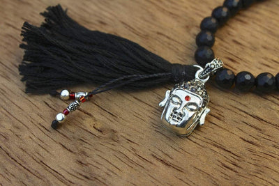 This bold mala features matte faceted onyx beads with Hill Tribe silver spacers. The handmade tassel is cotton with tiny glass and Hill Tribe silver beads and is paired perfectly with our new pewter Buddha pendant with inlaid gemstones.