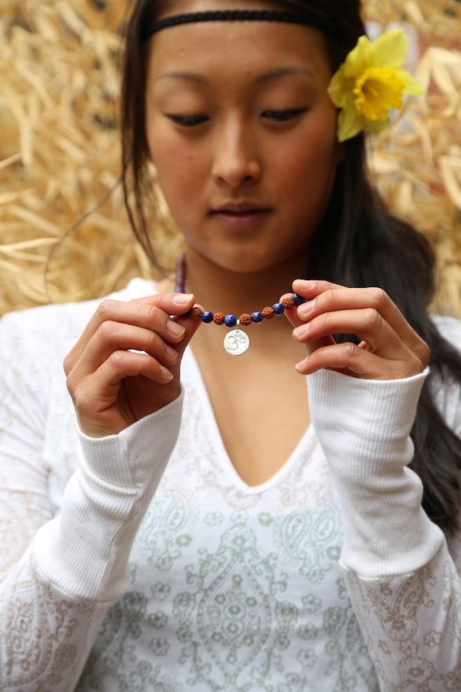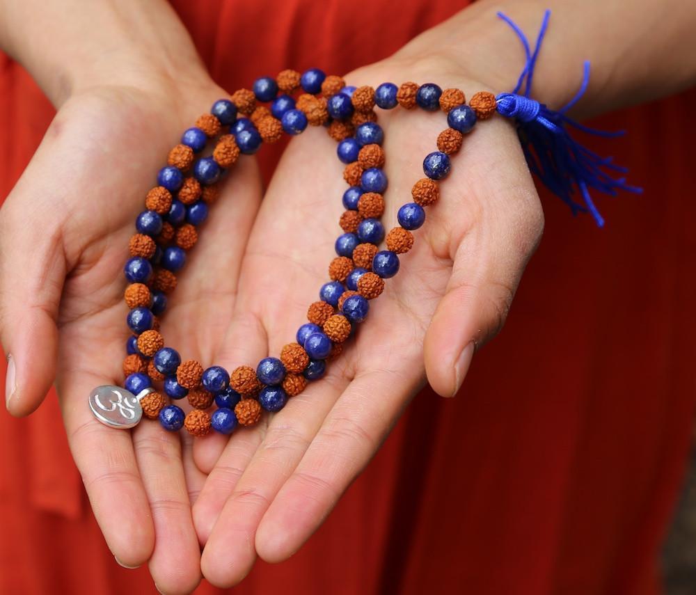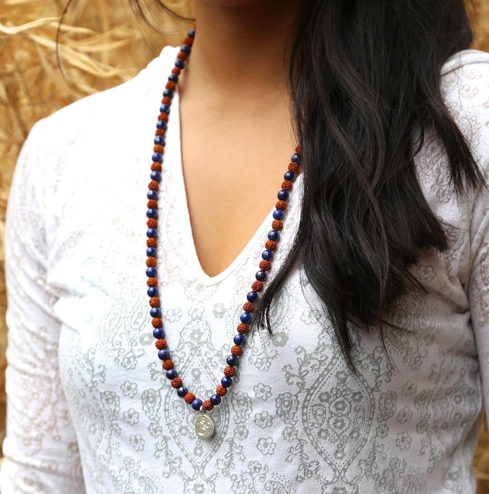 Sensational natural rudraksha and lapis mala. Finished with silver Om charm and blue tassel.