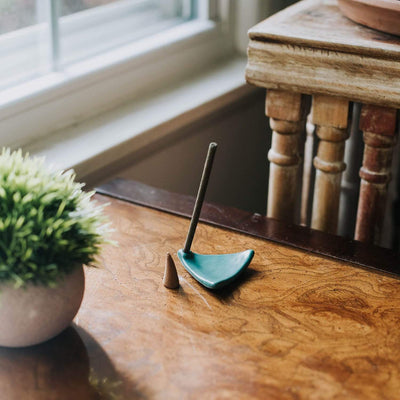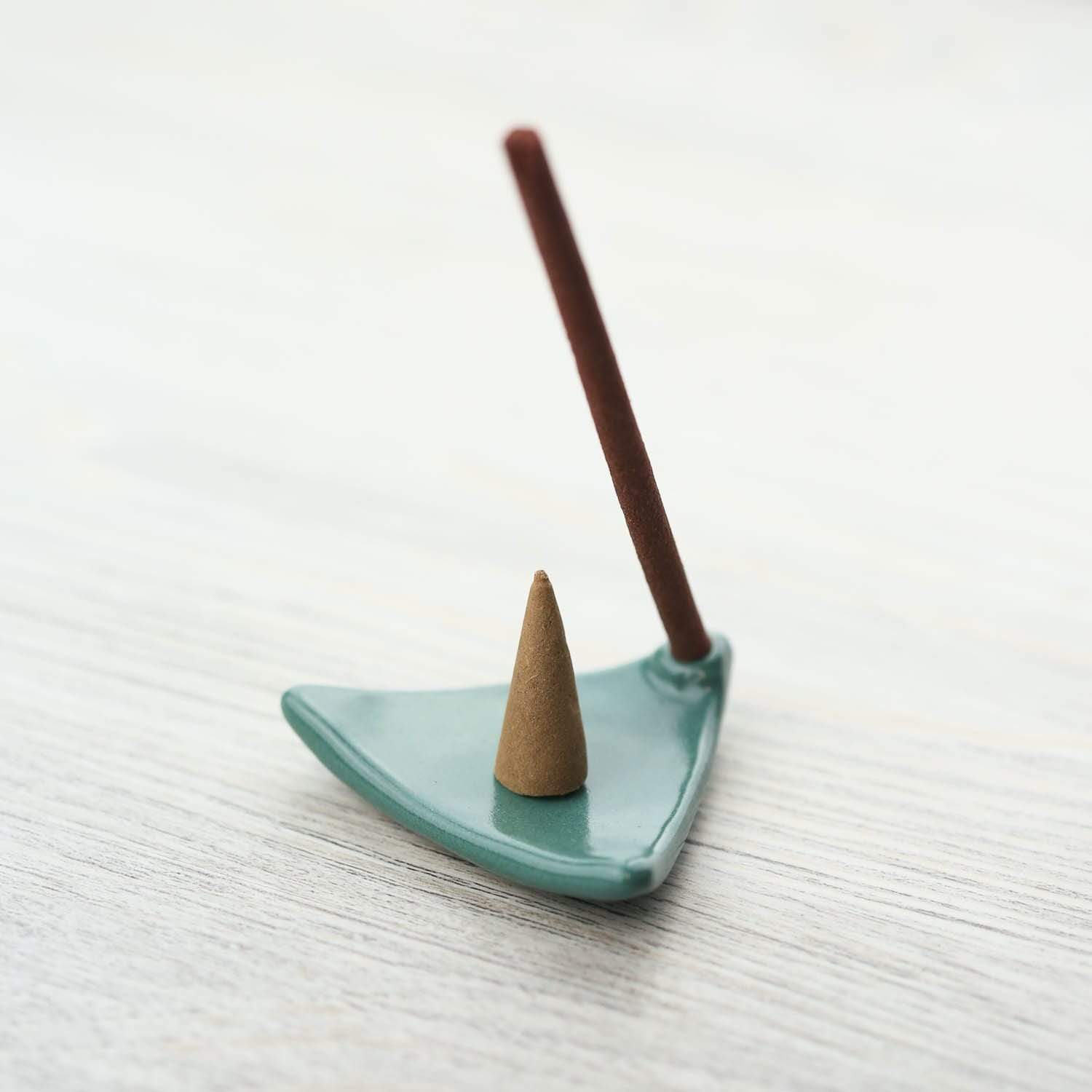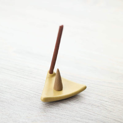 The triangle shape can represent harmony between mind, body, and spirit. Burning incense is great for encouraging relaxation and focus during personal meditation, cleansing the energy in your surroundings, or purely for enjoying the fragrance. Comes in two colors: marigold yellow or blue aquamarine.