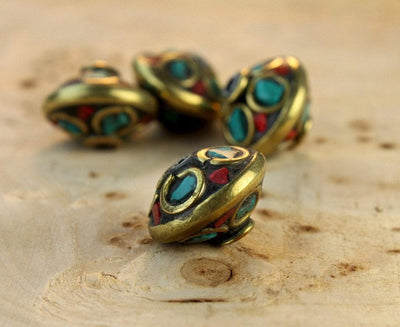A small, traditional Tibetan bead with brass and inlaid turquoise and coral. Would be a nice addition to any mala, bracelet or necklace.