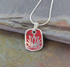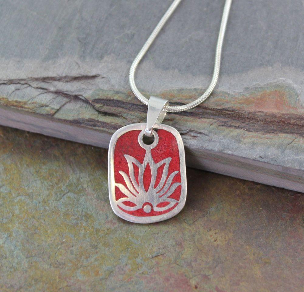 I love what I do for a living! I saw a sample of this pendant in 2010 in Kathmandu and we went through a few samples to get it just right. This beautiful pendant is inlaid with red copal and silver plated to create a perfectly peaceful Tibetan lotus. Working with Nepali, Newari and Tibetan artisans has been the joy of a lifetime. I love this pendant!