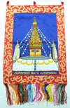 This wall hanging celebrates the energy of the Swayambhunath Stupa—often called the Monkey Temple—one of Nepal’s most revered sites. The bold embroidery highlights the Buddha’s wisdom eyes while prayer-flag motifs suggest blessings carried on the wind. Bordered in traditional Tibetan brocade, it brings a touch of Kathmandu to your sacred space and invites focus, calm, and devotion.