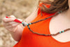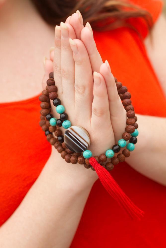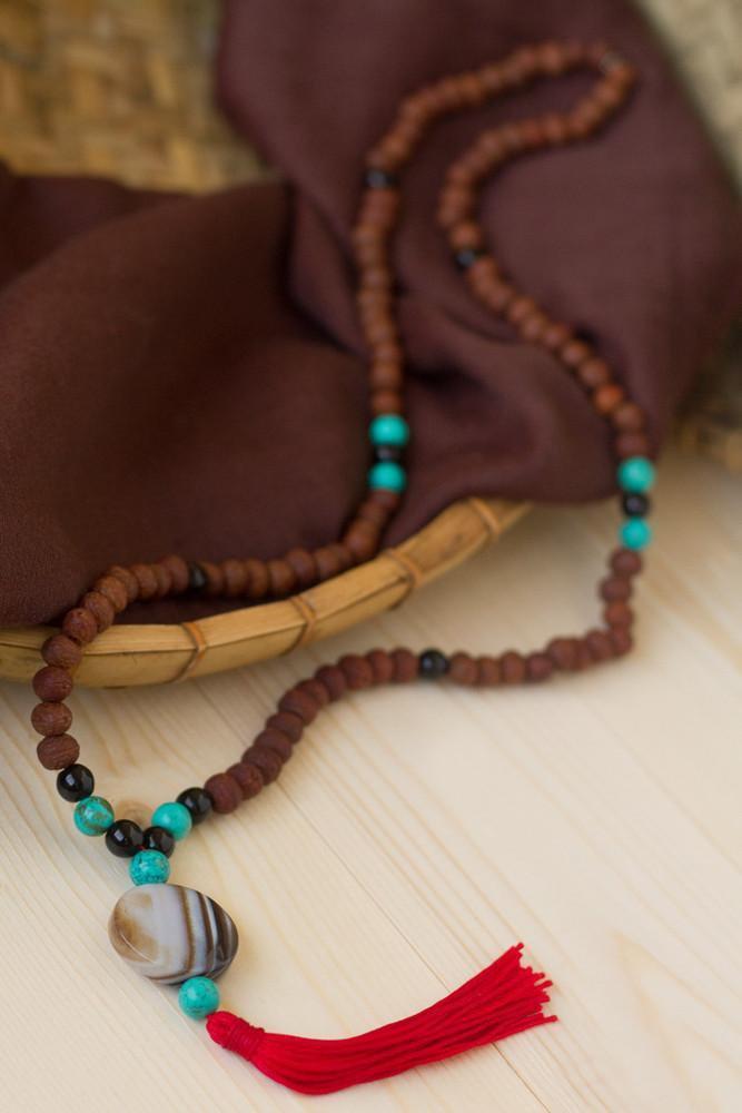 This classic 108 bead Raktu seed mala features onyx and turquoise accents. Finished with a striped agate bead and red tassel.