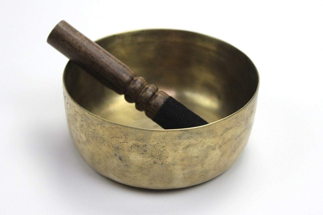 5 inches wide by 2 1/4 inches deep, hand hammered. Sings with a C tone when struck.