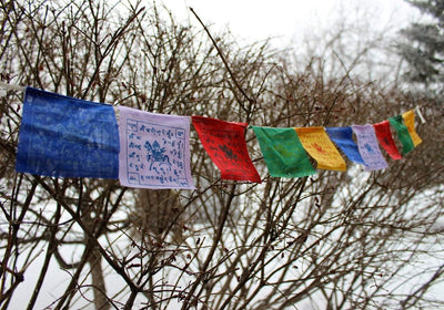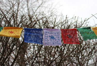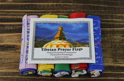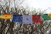 Made in Kathmandu, Nepal. 100% cotton on a polyester cord. Traditional flags with central image of a Windhorse.
