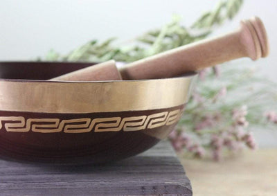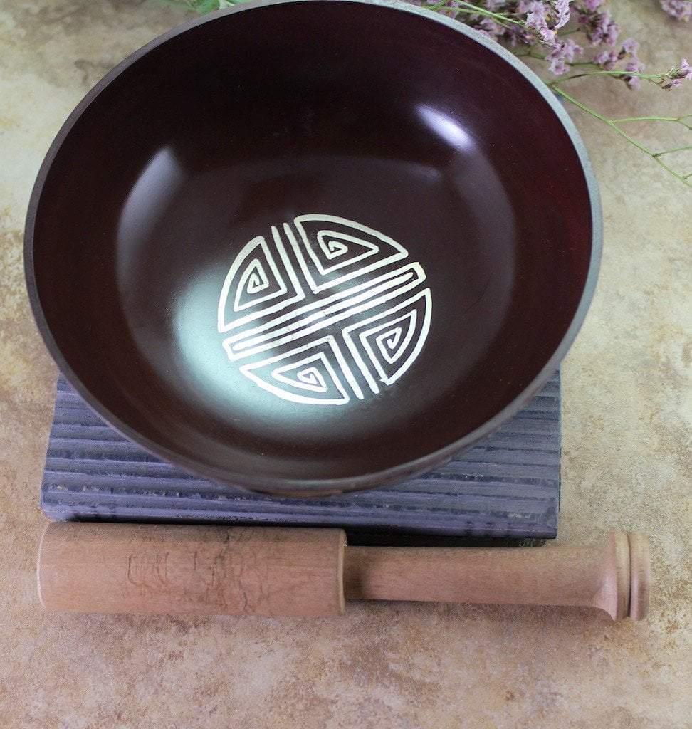 Shallow 6 inch cast copper bowl with silver geometric designs and a reddish-brown finish. Cast singing bowls are a great gift for the novice or beginner. Their tones are clear, crisp, and easy to play for prayer, meditation, relaxation, or pure enjoyment!