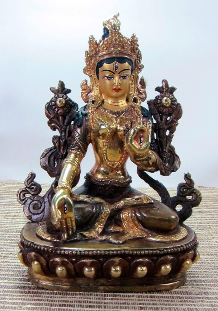 Bronze statue is cast using the Lost Wax method and then painted with gold. The painted details on this White Tara's face are beautiful. White Tara is associated with compassion, long life, healing and serenity. She is also known as The Wish-fulfilling Wheel.