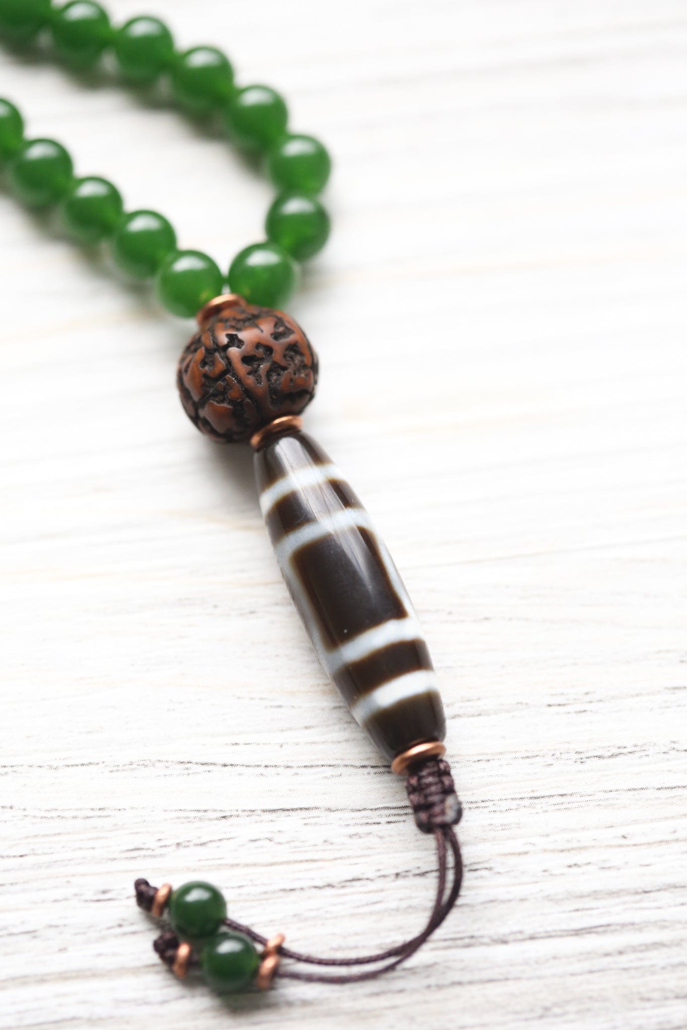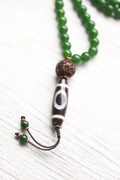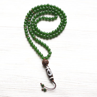 This exclusive DharmaShop mala is a well-traveled one to say the least. We took a stunning Sky Door Dzi from Taiwan, Maha Rudraksha and Jade beads from Nepal, and hand-strung them right here at the DharmaShop using traditional methods and design learned from our Mala artisans in Kathmandu. Aside from it being a gorgeous design, we hope it's journey to help you on yours is felt.