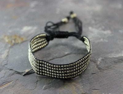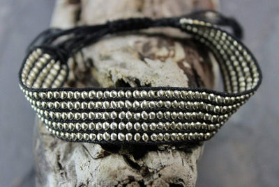 Silver plated brass beads on black cotton cord.