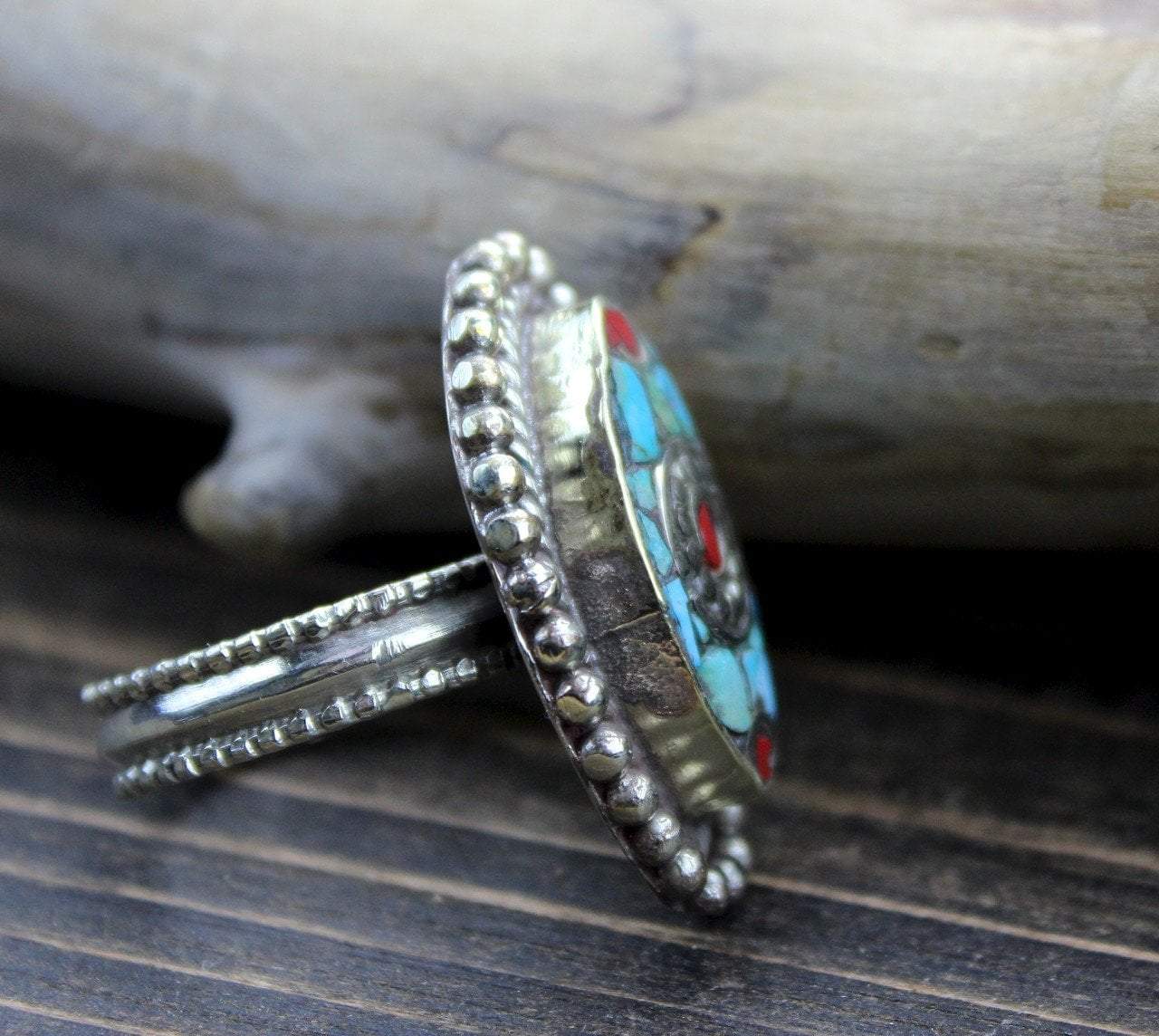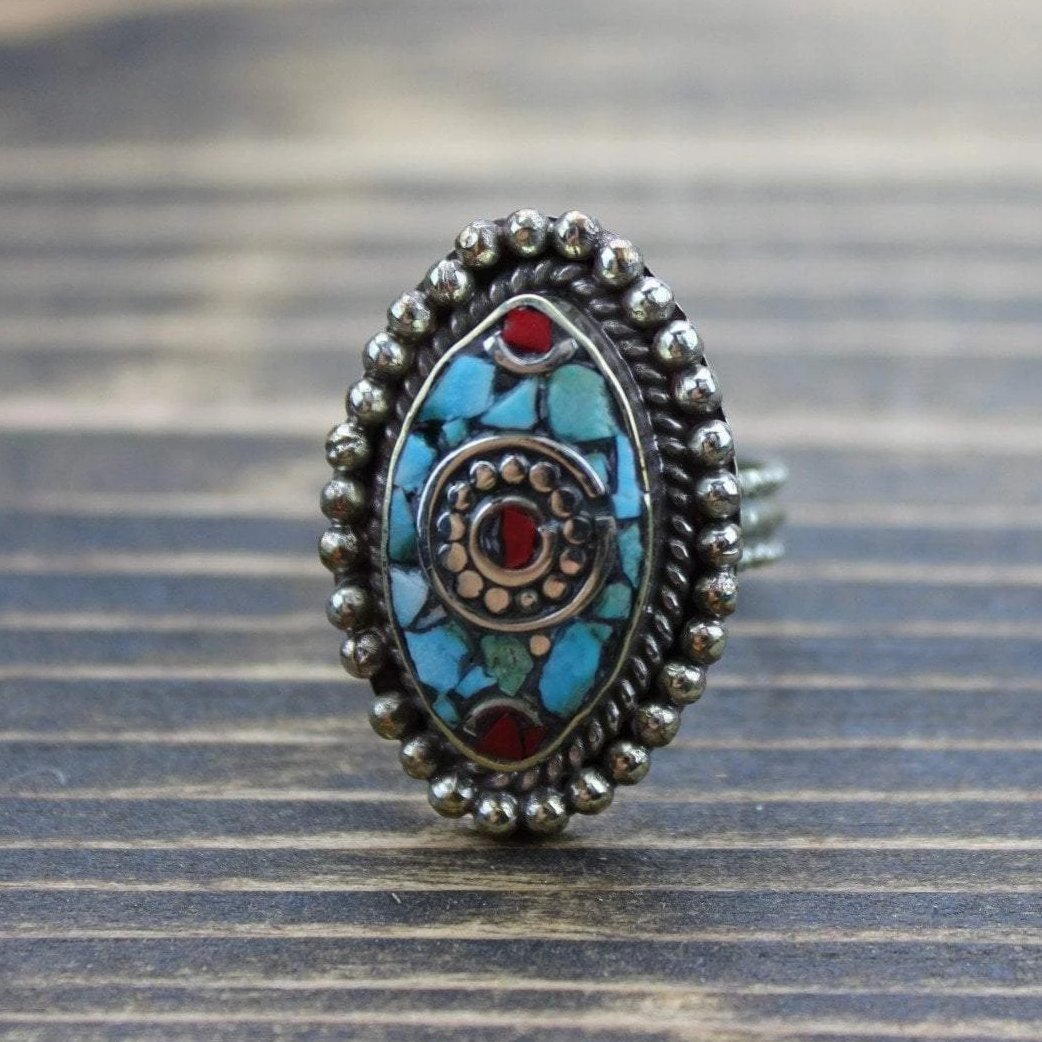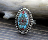 Handcrafted white metal, Tibetan style, ring with inlaid coral and turquoise stones.