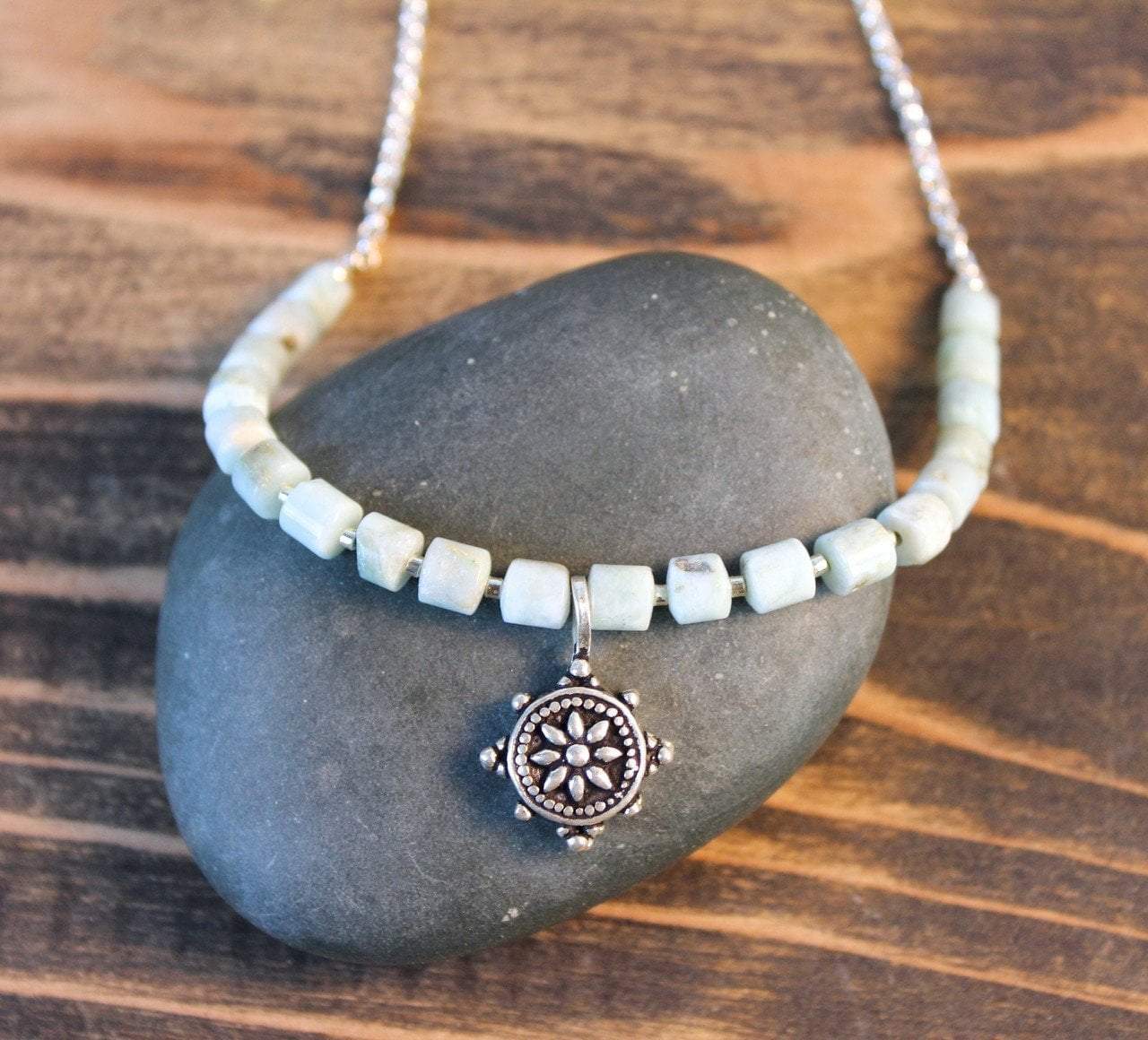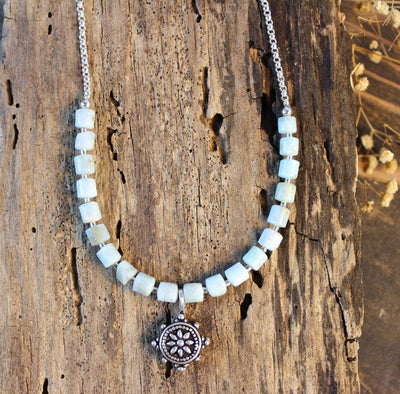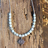 These beautiful and unique Larimar stones are strung on a sterling silver rolo chain with a Dharma Wheel pendant.
