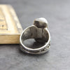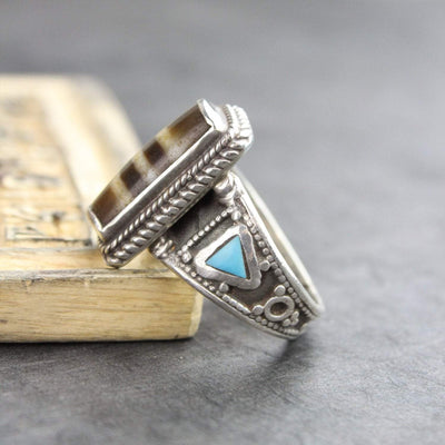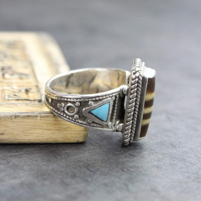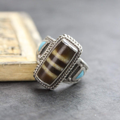 These true agate Dzi stones are placed into silver settings and feature beautiful rope-work with two turquoise accents on either side. Each bead may vary slightly from ring to ring, but each will have three distinct linear markings.