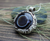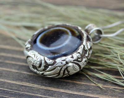 A truely stunning statement piece! Agate wrapped a handcarved, detailed, sterling silver dragon. Each stone is unique.