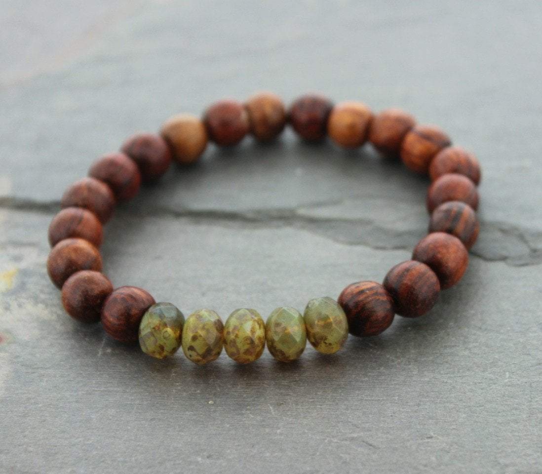 8mm redwood beads combine with milky amber czech beads to make this striking bracelet. Redwood beads made in Nepal. Czech glass from the Czech Republic.