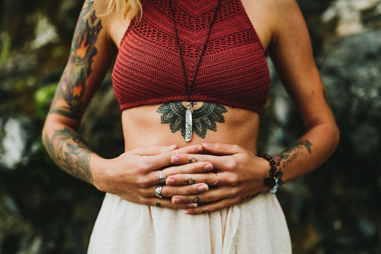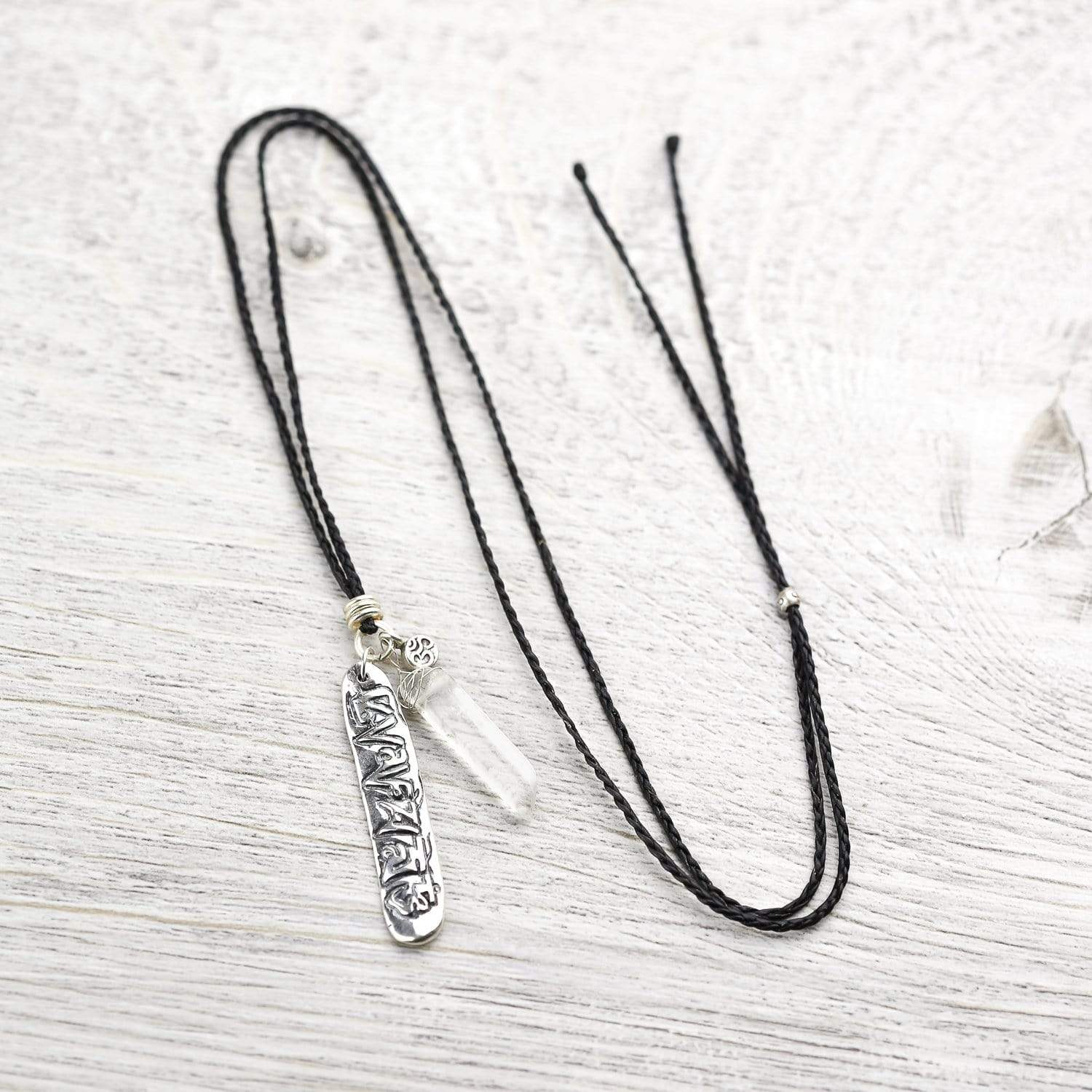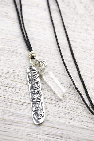 • Alongside of the crystal quartz is a hand stamped pendant with the mantra of compassion, Om Mani Padme Hum, and an additional small charm stamped with the Om symbol.