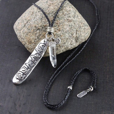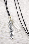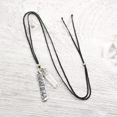 • Handmade in Thailand, this necklace features 98% pure Hill Tribe silver elements along with a piece of quartz crystal on an adjustable black waxed cord.