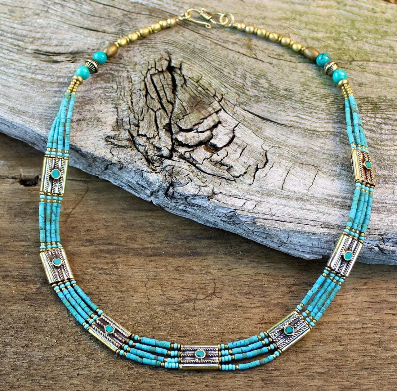 The perfect addition to our Ananda Bracelet. Brass and turquoise beads with four strands of hand strung turquoise beads. Seven decorative brass spacer beads each with its own inlaid turquoise stone. Clasp for secure closure. Handmade in Nepal.