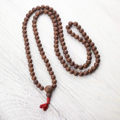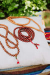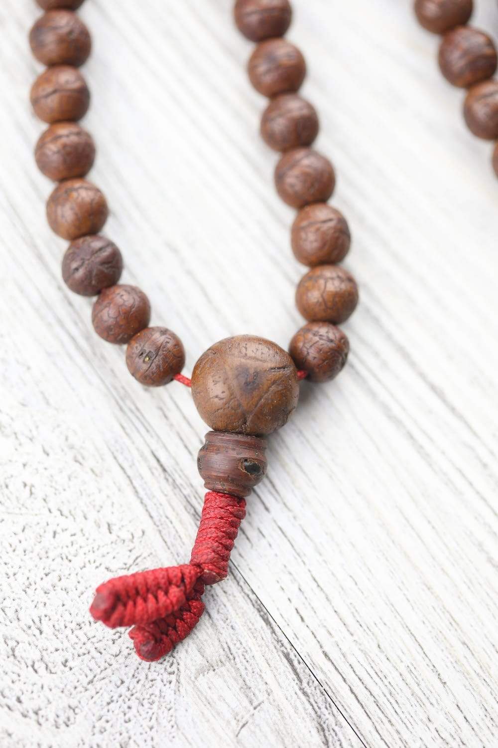 • Made of 108 small, well used dark bodhi beads with.  Each bead is rich in color with a beautiful sheen as well as its own shape and texture.  Mala has been restrung in recent years on bold red cord with traditional tied ends.