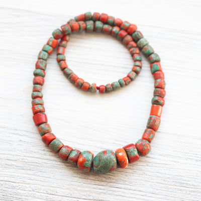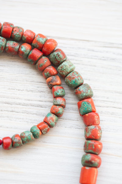 This past winter, Sander, founder and owner of DharmaShop, met with a Nepalese trader and collector friend he has known for nearly 20 years. He was in the states visiting and brought a few strands of incredible antique coral in his luggage. Once we saw it, we just fell in love with the story it's details and characteristics tell. Each chunk of coral has it's own markings and shape.
