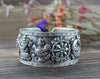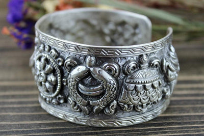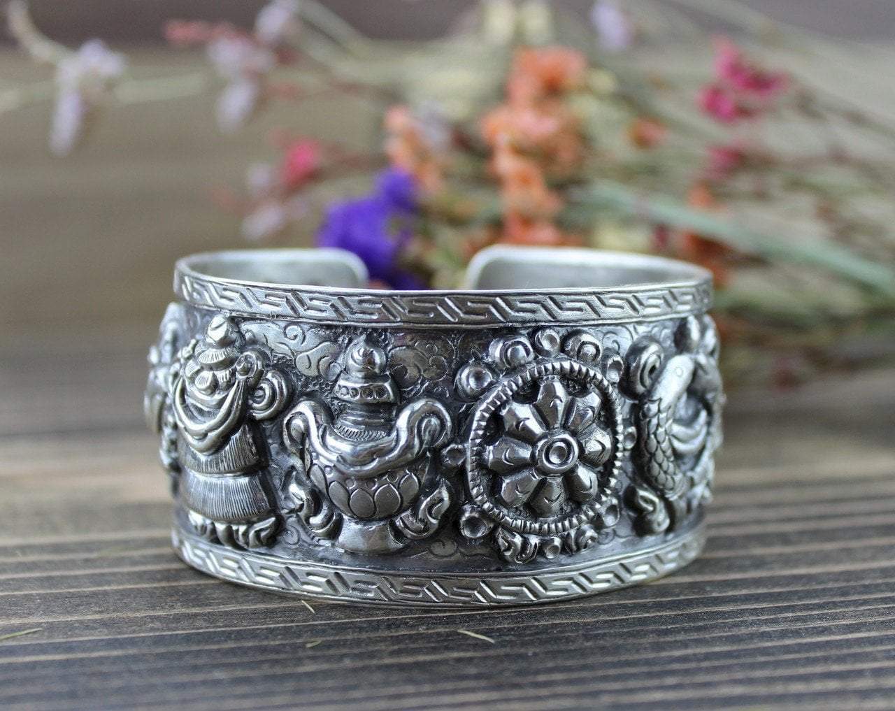 Sterling silver cuff bracelet with intricate, hand-done, carvings of the Auspicious Symbols.