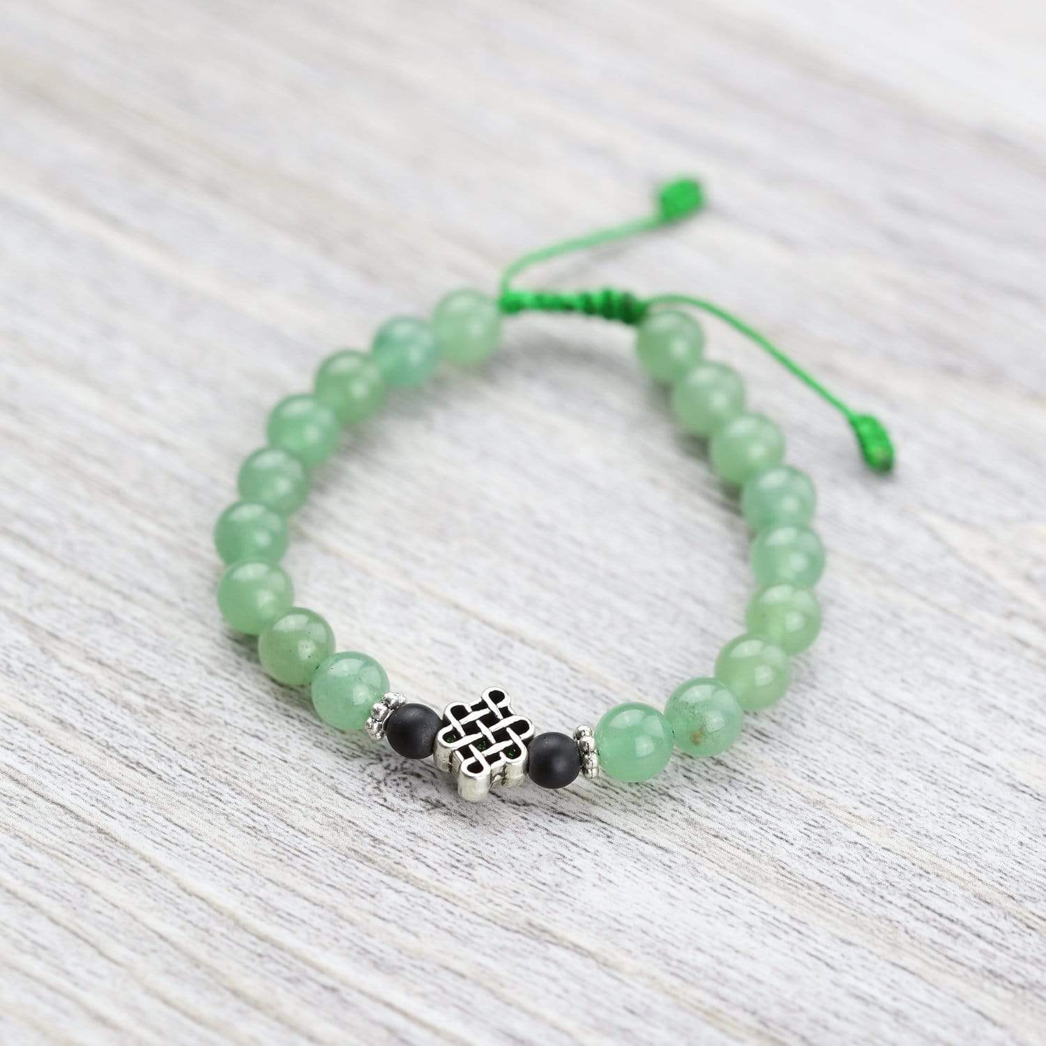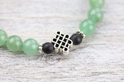 Adjustable wrist mala measures approximately 6.75 inches around when fully tightened and opens to about 9 inches. Aventurine beads are 8mm, onyx beads are 6mm. Charm is about 0.5 inch.
