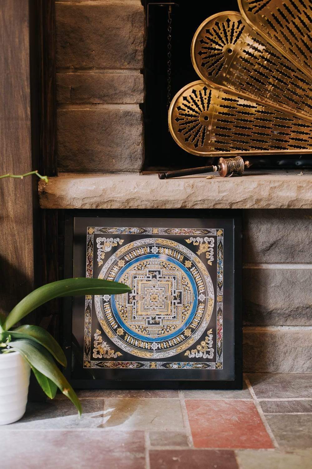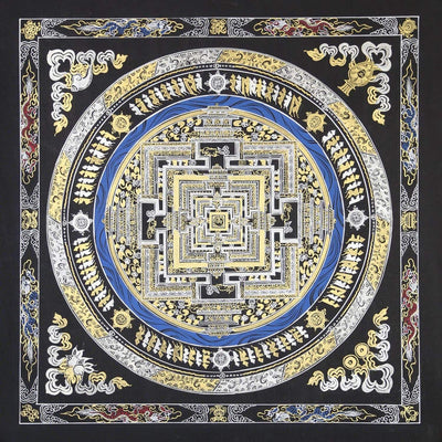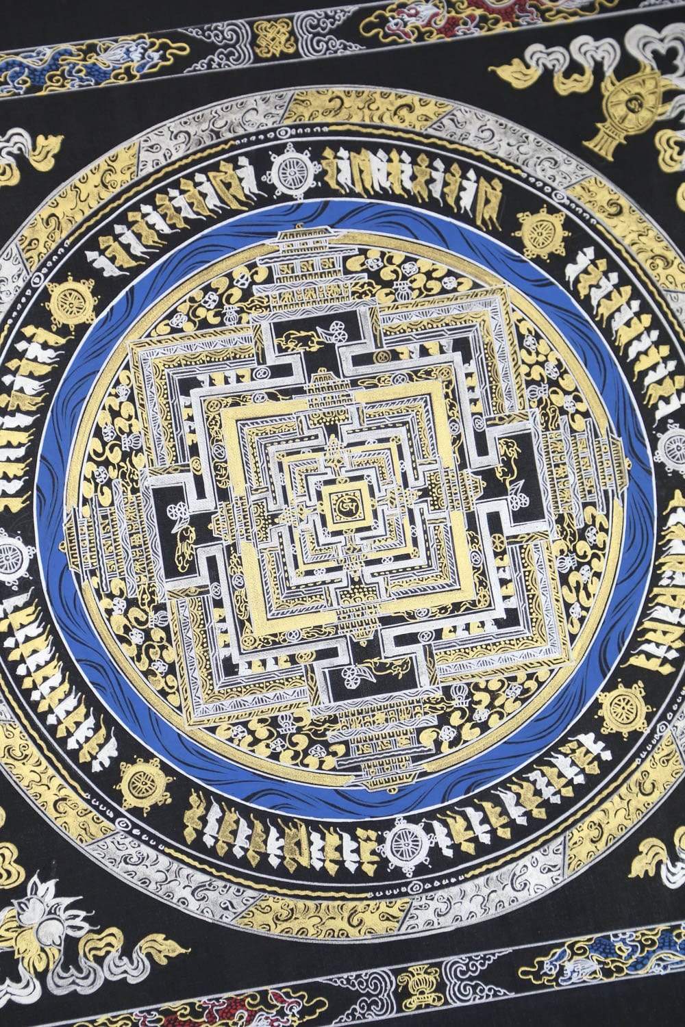 • This thangka features a Kalachakra mandala design painted entirely by hand with 24K gold and silver.  Each and every detail is mesmerizing!