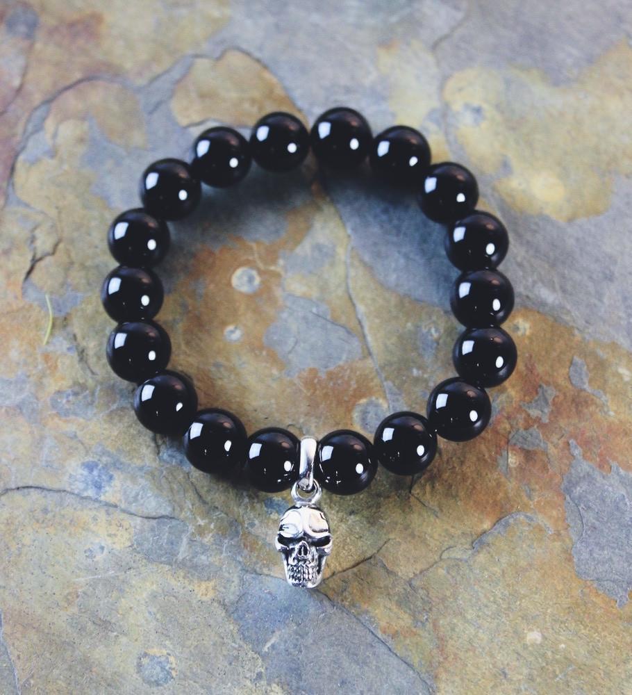 Our bold 10mm Onyx beads with an amazing solid silver skull charm with onyx eyes. The skull in Buddhism is a symbol of impermanance and is a powerful reminder to be here now!