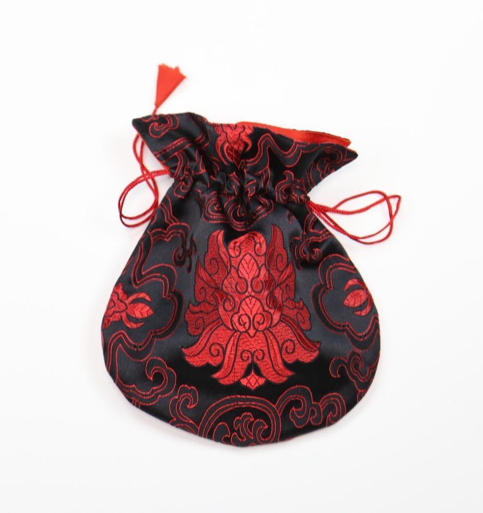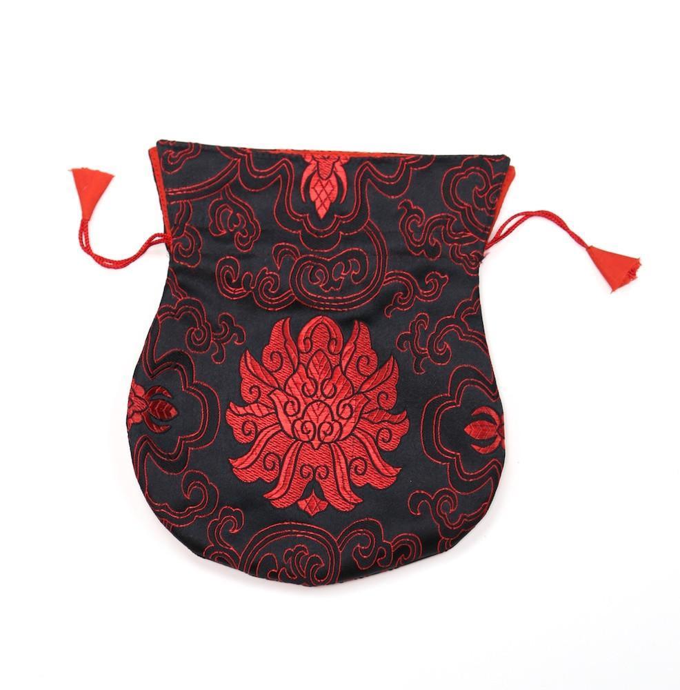 Perfect for traveling with your mala or for use as a unique, elegant clutch. Constructed of medium-weight, embroidered silk with a durable red cotton liner. Includes red drawstring closure.