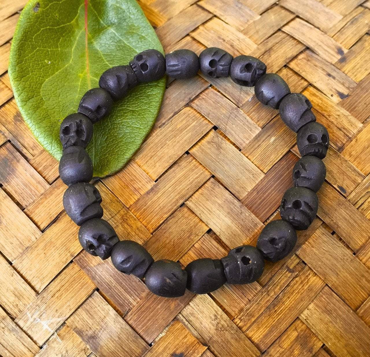 Can fit wrists 6 to 8 inches. Measures approximately 6 1/2 inches around on stretchy cord. Skulls are 8mm by 9mm.