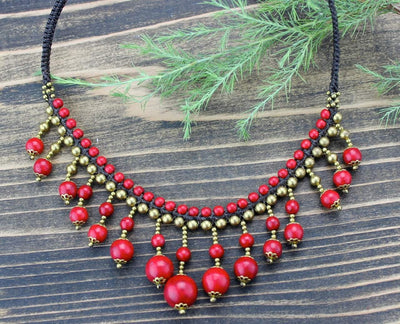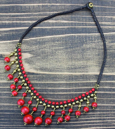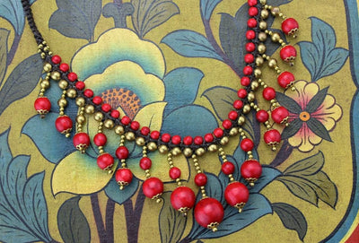 We love these new necklaces from India, handmade in a Tibetan community. Brass and pressed coral beads dangle from a hand knotted cotton necklace.