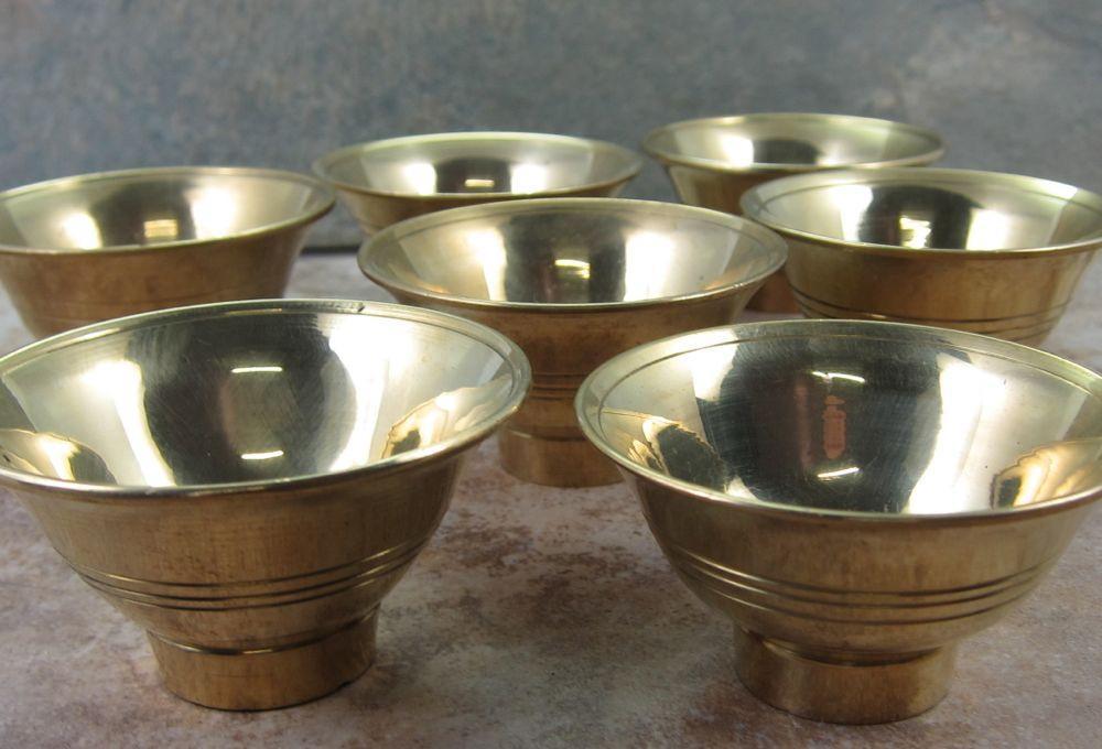 Set of 7 brass offering bowls. Etched with three lines around outside. Footed.Size:2 1/2 inch diameter