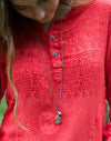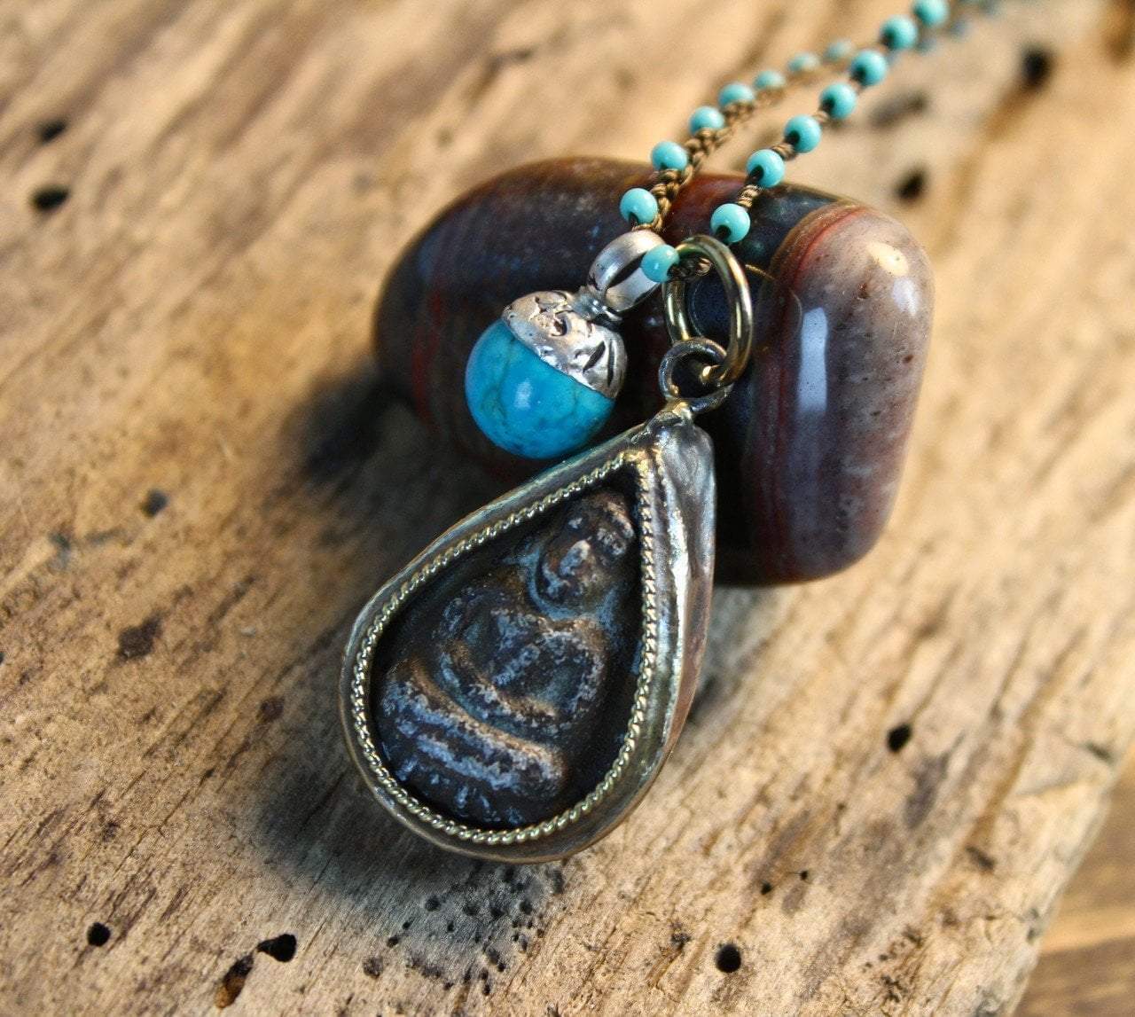 A faux turquoise bead is paired with this Thai Buddha pendant and strung on hand woven turquoise bead cord.