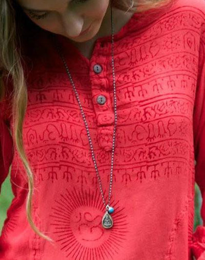Necklace measures 34 inches around. Buddha pendant measures 1 inch tall and 1 3/4 inches at its widest point. Turquoise stone measures about 1/2 of an inch tall.