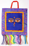Bold blue wall hanging features Buddha Eyes and blue, red, and yellow brocade with multicolor fringe.