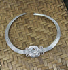 This necklace is made of several strands of metal that are welded together on 2 ends, and form an intricate knot in the middle. Around the knot on both sides, there are other pieces of metal that form 4 layers of metal in the shape of braids perpendicular to the main strands of metal, followed by two loops, continuing in another 4 layers of perpendicular, "braided" metal. The knot in the middle with the braided metal decorations make this necklace a bit heavy on that end, but this works well to keep it in place. It is very malleable and easy to fit.