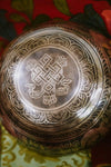 An Eternal Knot symbol grounds the base of the bowl. The Endless, or Eternal Knot has special meaning throughout many cultures and can serve as a reminder of interconnectedness and unity. It is one of the 8 Auspicious Symbols that represents the intertwining of wisdom and compassion.