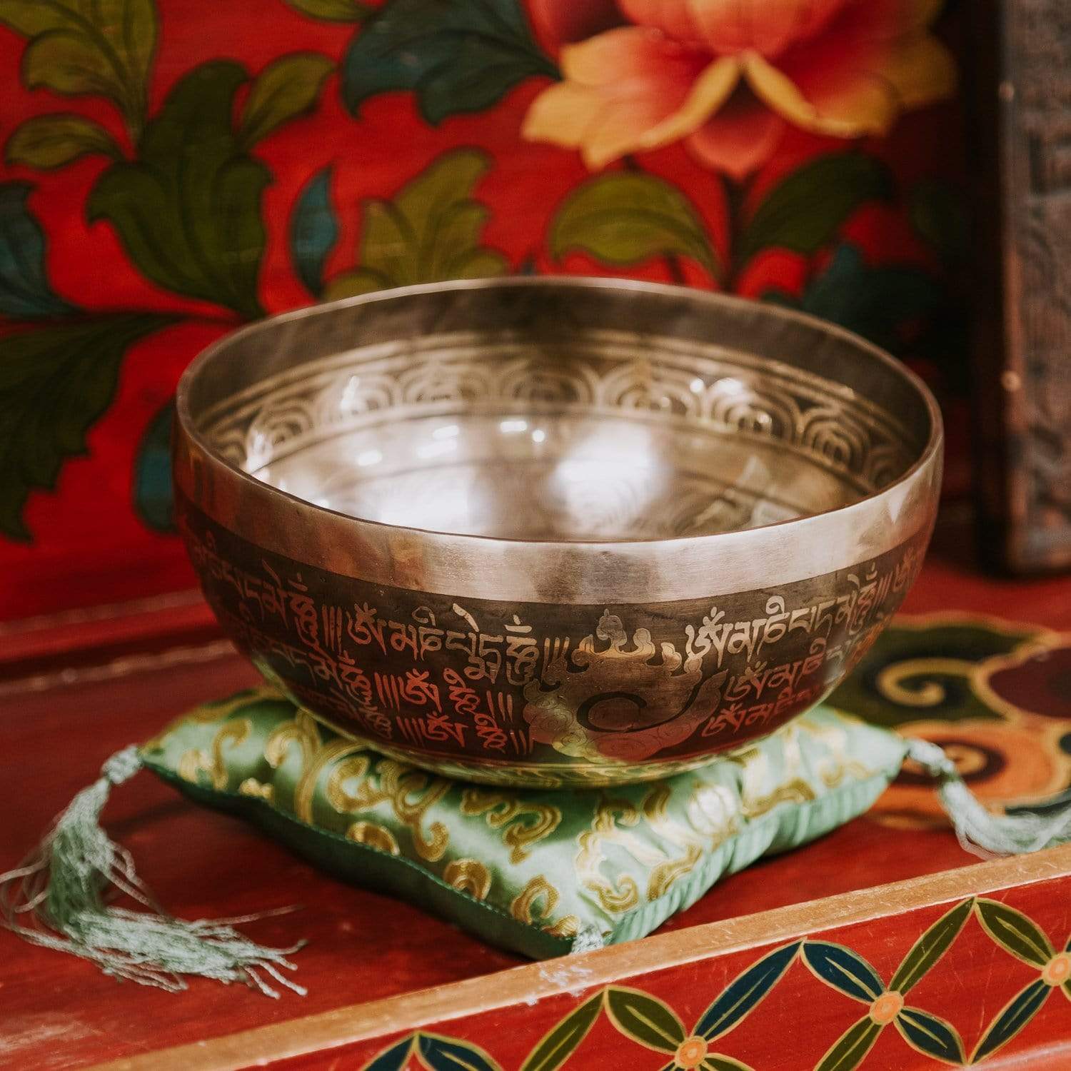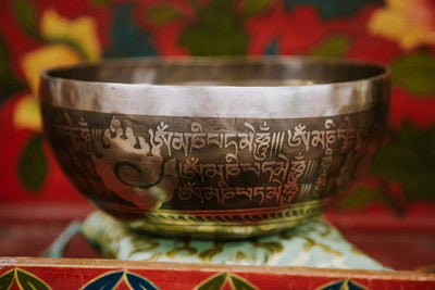 The mantra of compassion, Om Mani Padme Hum, written in Tibetan script, decorates the outside of the bowl. This mantra invokes the powerful benevolent attention and blessings of Chenrezig, the embodiment of compassion.