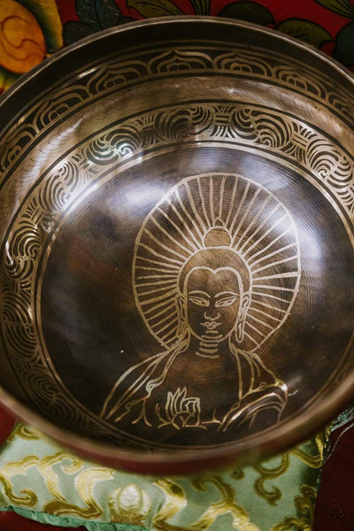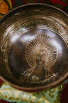 A serene meditating Buddha is prominently featured inside of the bowl using the teaching mudra, also known as the vitarka mudra. The thumb and index finger touch each other, forming a circle that represents a constant flow of energy. This mudra symbolizes the discussion and transmission of Buddha's teachings.