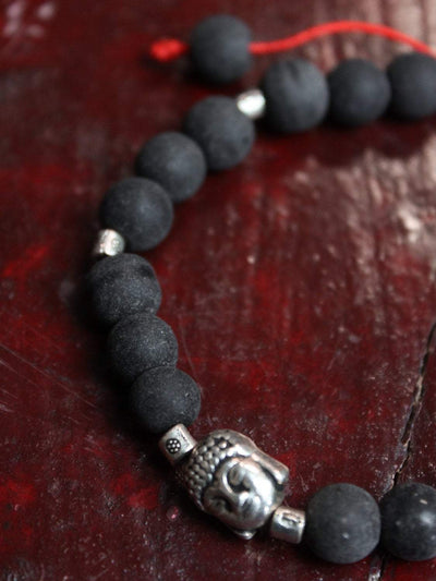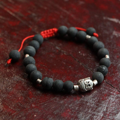 Adjustable wrist mala that features matte onyx beads with tiny silver-plated spacers and Buddha charm on red cord.
