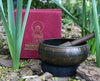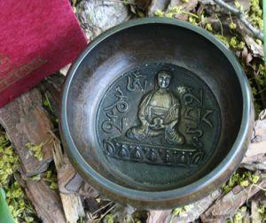 This hand hammered bowl is carved by a master artisan with an image of the buddha in the bottom of the bowl. Gift set includes natural lokta paper box, cotton cushion and 2 piece striker. Size:4.5 inch bowl