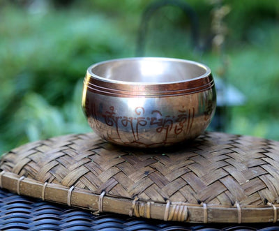 Blended metal cast singing bowl features Chenrezig hand painted in copper and beautifully set on the inside.  The full circumference along the outside of the bowl is decorated with the mantra of compassion, OM MANI PADME HUNG, while a double dorje symbol anchors the very bottom.