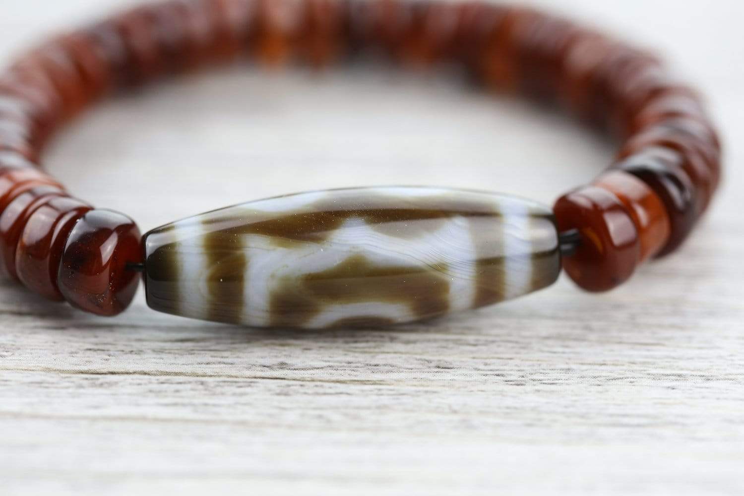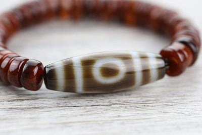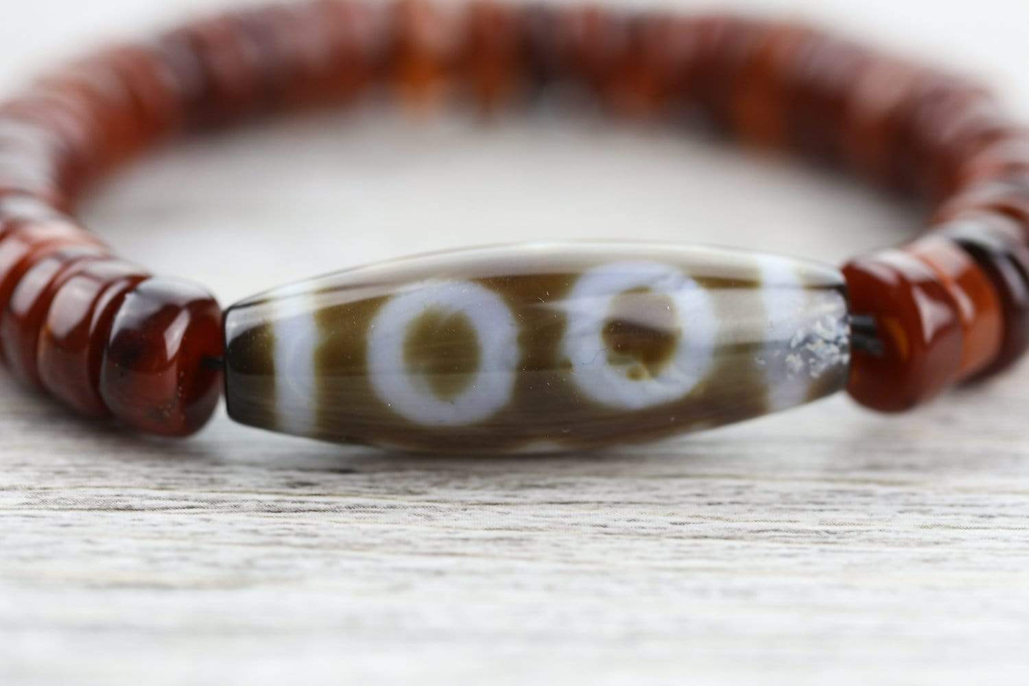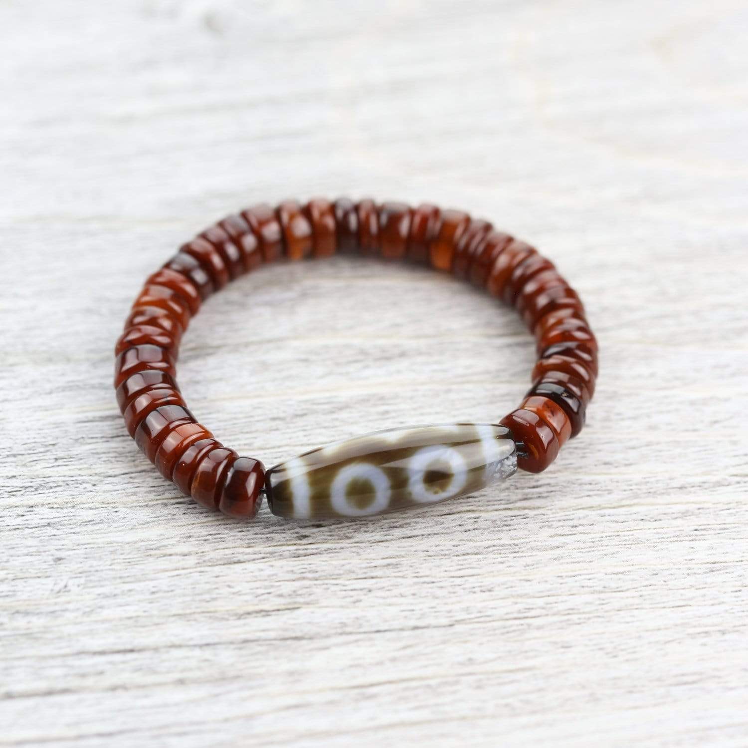 Bracelet measures approximately 6.25 inches around on stretchy cord. Beads are 9-10mm disks. Dzi measures about 1.5 inch long and is 0.5 inch wide. Hand strung at the DharmaShop!