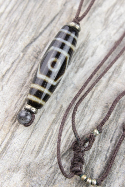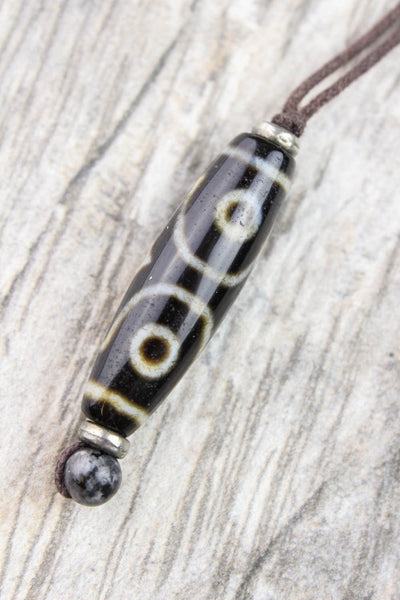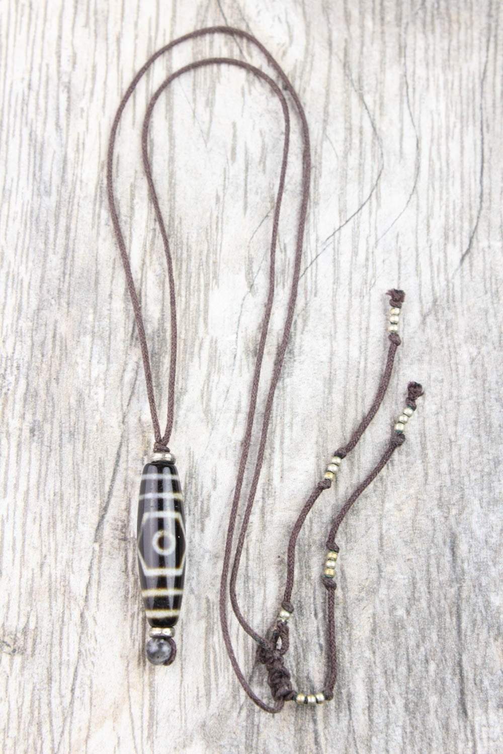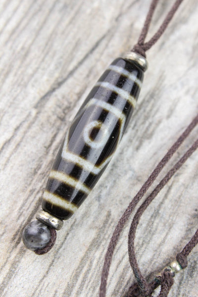 An absolute favorite from Christy's personal collection, a one-of-a-kind 3 eyed Dzi bead necklace. This amazing true agate Dzi comes from Sander and Christy's collection of beads purchased during the last 15 years of traveling Asia. Features gorgeous agate banding and cinnabar dots, hand strung on dark brown cord.