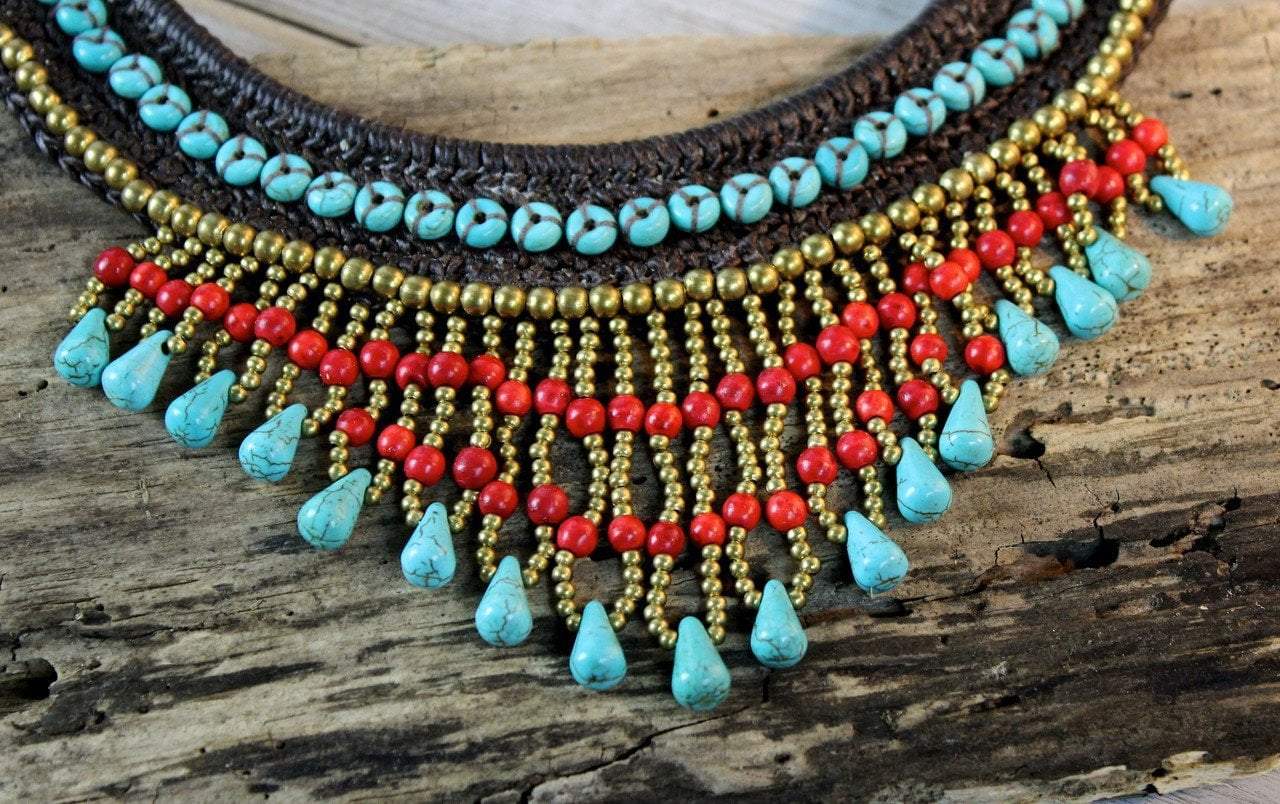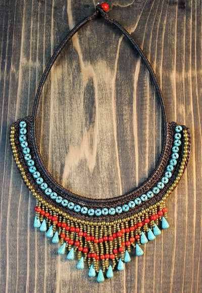 This traditional Tibetan bib necklace is definitely unique. This modern version of a traditional favorite is made of coral, turquoise and brass beads are hand woven on dark brown wax cord. 100% handmade in Nepal.