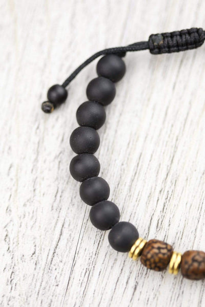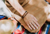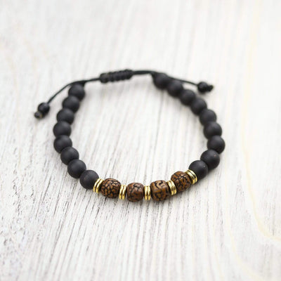 Adjustable wrist mala measures approximately 6.75 inches around when fully tightened and opens to about 10 inches. Beads are 8mm.